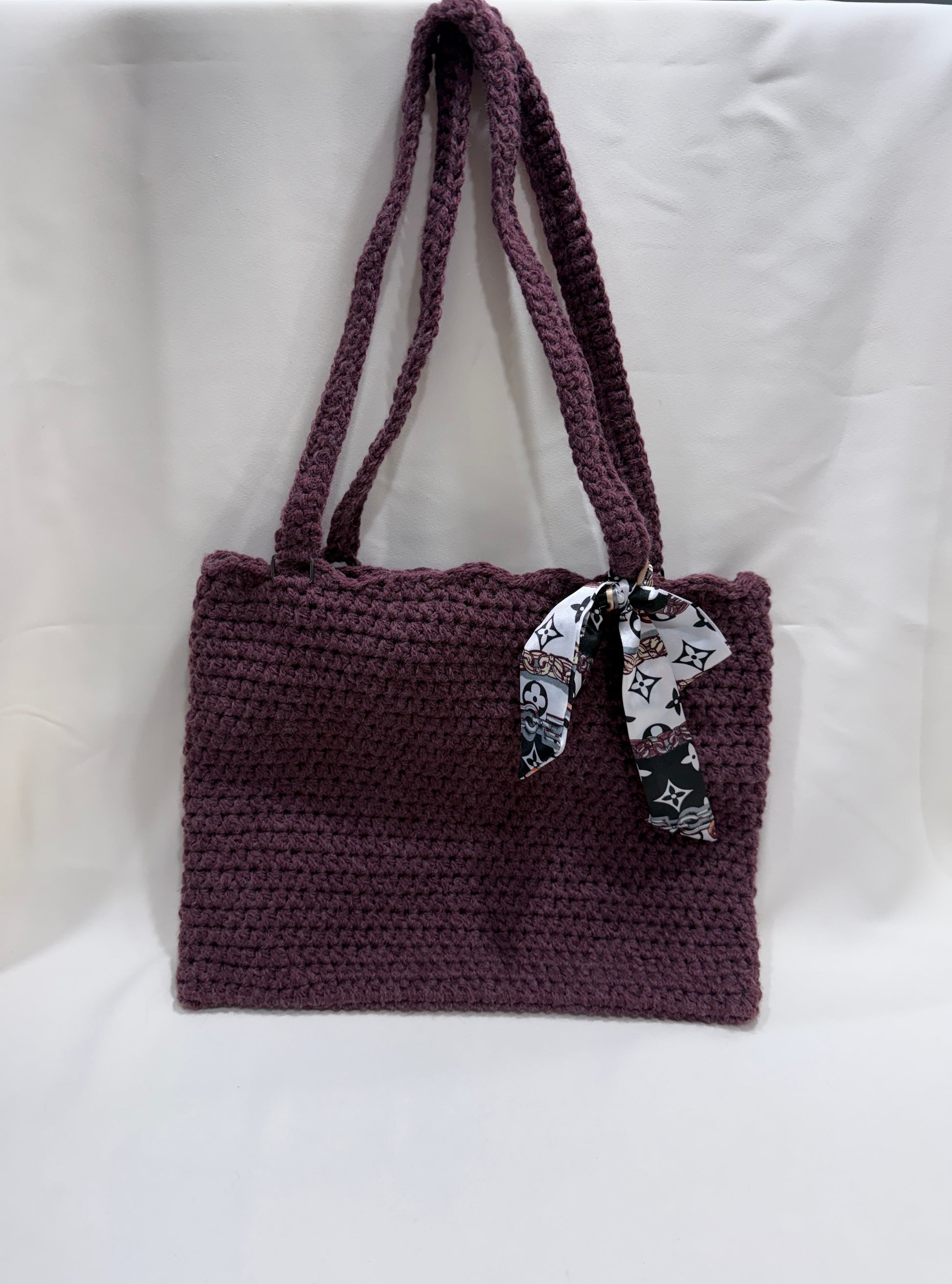 The thick, sculpted stitches create a sturdy body that holds its shape while remaining comfortable to carry. Wide handmade shoulder straps provide all-day comfort, and the generously open interior makes it easy to grab your essentials on the go. Finished with a removable scarf bow (pattern varies), this tote adds a touch of personality and can be styled up or down with ease.