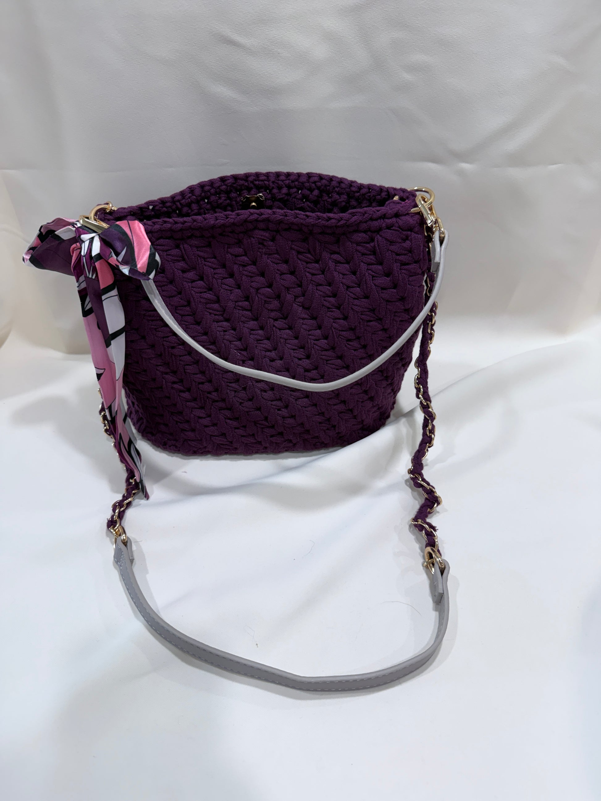 Hand-crocheted using premium ribbon tape yarn, this bag features a substantial, structured feel with beautifully defined stitches that help it hold its shape with ease. The rich plum tone adds warmth and sophistication, making it a standout piece that complements both casual and dressy looks.